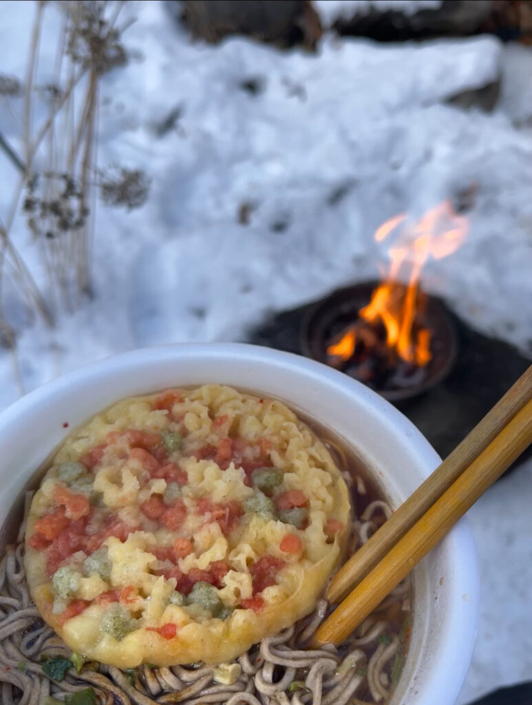 庭でちっちゃな焚き火して、お湯沸かして食べたみどりのたぬきは