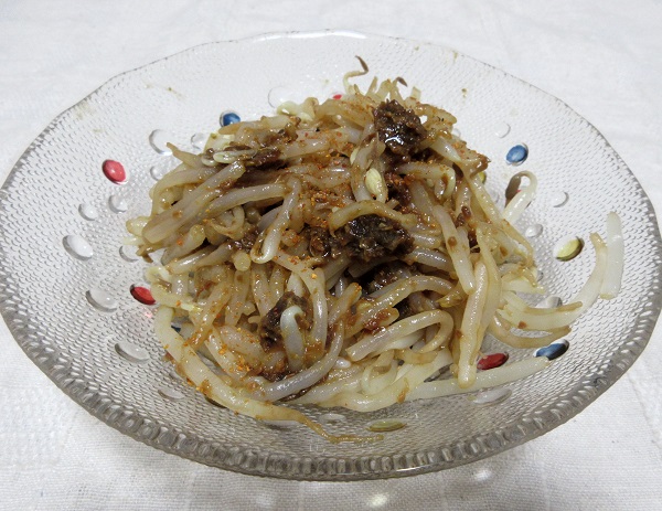 昨夜の一皿=もやしの味噌和え。手前味噌を使い切った後の袋で作りました。